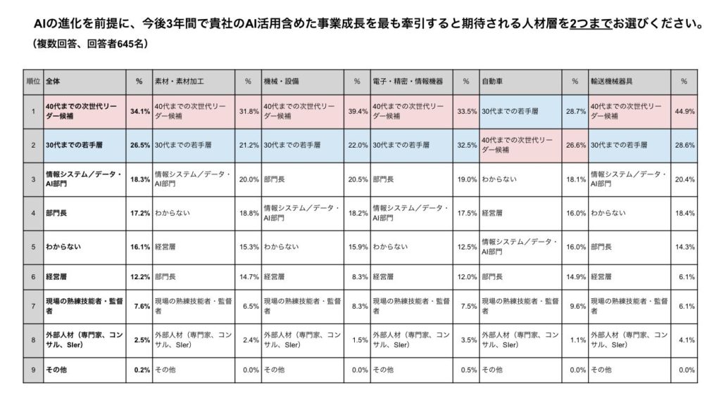 今後3年でAI活用を含む事業成長を牽引する人材層として「40代までの次世代リーダー候補」「30代までの若手層」に期待が寄せられていることが明らかになった。