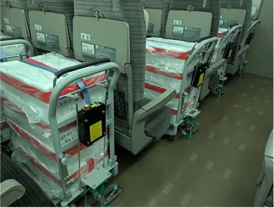 車両は荷物搭載スペースを確保するため、客室内の座席を全て撤去。荷物をかご台車に載せたまま車内に搭載するため、床面をフラット化した上で鉄板を敷き、滑り止め加工を施している。また、車内に設置したベルトで荷崩れを防ぐ。