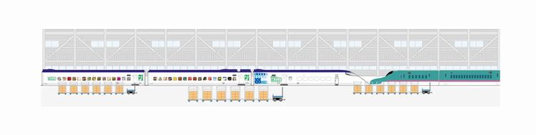 また、今年4月に臨時列車の一部客室を使用した大口輸送サービスもスタート。現在は毎週金曜日に最大200箱程度の輸送が可能になっている。ただ、より多量の荷物を高頻度で輸送してほしいとの声が上がっているのを考慮し、E3系新幹線1編成の全号車を荷物専用車両として改造することにした。