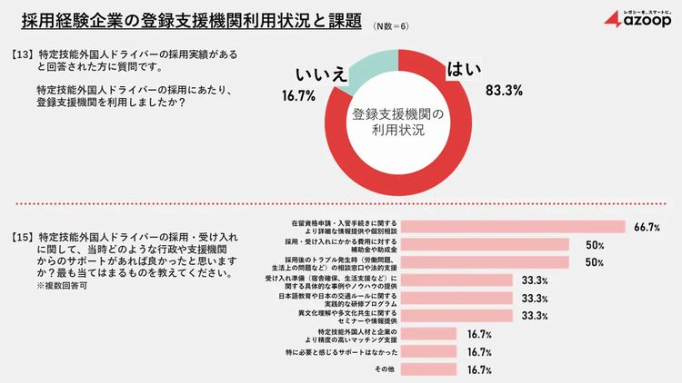 Azoopは12月11日、運送従事者111人を対象に実施した、政府が2024年12月に開始した特定技能外国人ドライバー制度に関する意識調査結果を公表した。