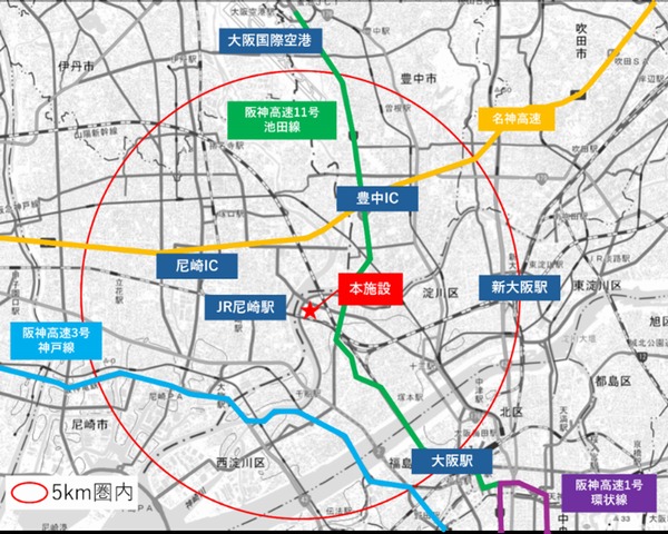 阪神高速11号池田線の加島料金所まで約2.2㎞、名神高速道路の尼崎ICまで約4㎞、名神高速道路の豊中ICまで約5.4㎞。