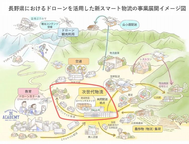 アルピコHD、セイノーHD系のセイノーラストワンマイル、エアロネクスト、NEXT DELIVERYは今年2月、新スマート物流を長野県全域へ拡大し地域課題の解決や地域経済の活性化を図ることを目的とした業務提携を締結した。今回の実証実験もその一環。
