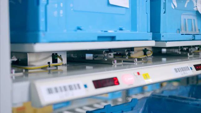 ウェイトアソートシステム WASは表示器のランプで仕分け先と必要個数を案内し、作業者は表示に従って商品を仕分けする。仕分け後は重量を自動で判定し、過剰に商品を投入しているとランプで即時に警告する。