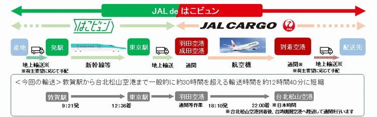 新サービス商品化の第1弾として、開始初日に福井から台湾まで北陸新幹線「かがやき」とJAL便で「越前がに」をはじめとした水産品を届ける。地域の特産品を新鮮な状態で輸送し、「ホテルメトロポリタン プレミア 台北」で福井県の食のPRを実施する。