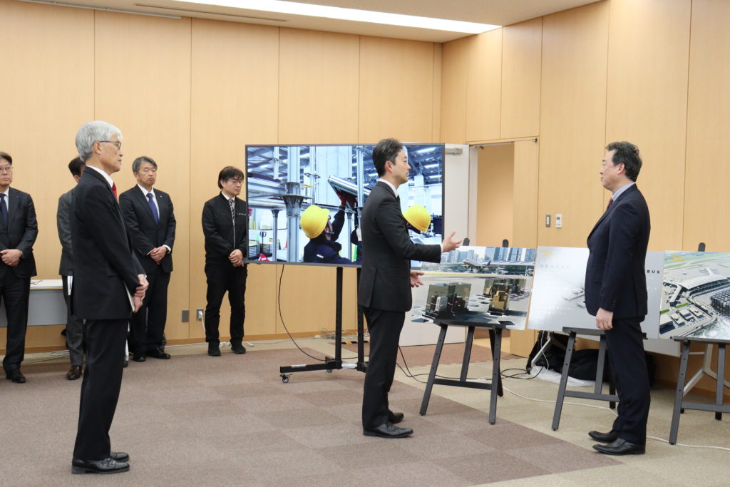 式典前に実証実験の説明を受ける熊谷知事(手前の右から2人目)と藤井社長(手前左端)