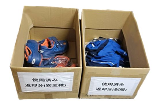 使用済みユニフォームと安全靴の回収箱