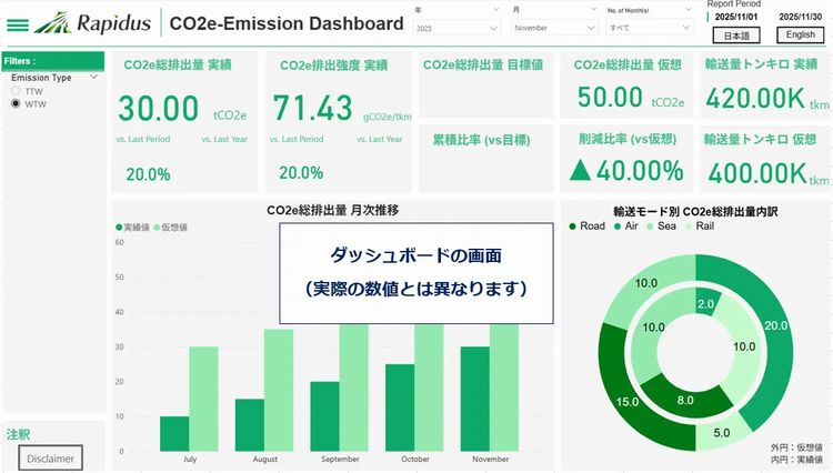 郵船ロジスティクスは1月13日、最先端ロジック半導体の開発・製造・販売を目指す国策会社Rapidus(ラピダス)の依頼を受け、2025年11月に、Scope3(自社事業の活動に関連する他社の排出分)のCO2e(温室効果ガスの影響をCO2換算量で表した数値)排出量削減効果を可視化するダッシュボードの提供を開始したと発表した。。