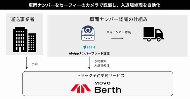 物流拠点の入退場口およびバースにセーフィーのクラウドカメラを設置し「AI-Appナンバープレート認識」により取得した車両情報をAPI連携させ、MOVO Berthへの入退場登録を自動で行えるようにする。