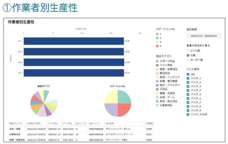 作業者ごとの生産性(時間当たりの作業量)を比較し、習熟度の把握やシフト編成に活用