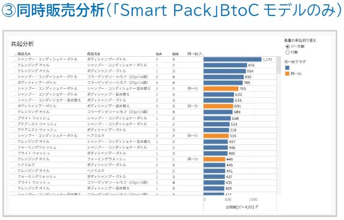 単一オーダーで同時出荷された商品の組み合わせを集計し、その数が多い順に表示する