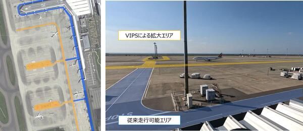 VIPSを活用することで航空機の位置をリアルタイムで認識できるようになり、システムによる走行可否判断が可能と想定。これまでレベル4自動運転が可能なエリアはターミナル周辺に限られていたが、VIPSを使えばターミナルから離れた駐機場(沖止めエリア)まで拡大できるとみている。