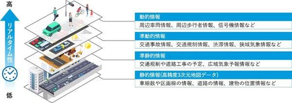 ダイナミックマップ情報は制限区域内のAI搭載カメラやセンサーが自動的に収集し、VIPSに登録する。情報は自動運転車両が走行するエリアに応じて必要なもののみ車両システムに配信。車両システムに搭載している「高精度3次元地図データ」と統合し、静的情報と動的情報を重ね合わせた「ダイナミックマップ」として、自動運転車両の正確な走行に活用することを計画している。