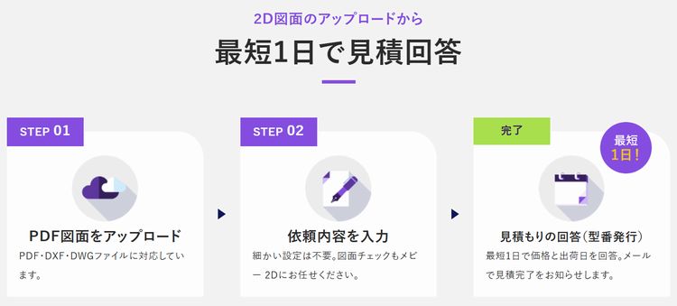 一方、メビー 2Dのサービスでは、図面をアップロードするだけで見積依頼が完了します。サービスの特長は以下の4つです。