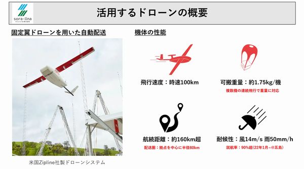 豊田通商子会社でドローン物流事業を展開している そらいいな(長崎県五島市)は1月27日、五島市内のスーパーや飲食店と提携し、総菜やテイクアウト商品のドローン配送を、LINEミニアプリ「注文くん」を通じて受注するデリバリーサービスを同日始めたと発表した。