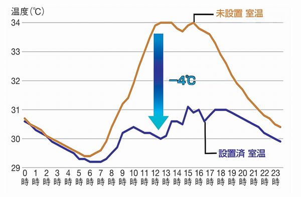 物流倉庫における庫内温度の抑制でも高い遮熱効果が確認できた。実際に元旦エコパネルを取り付けた倉庫側の協力を得て計測器を設置し、実測値を集計したところ、エコパネルを設置した室内と未設置の室内では、夏場で3~4度の気温差が生じた。担当者は「熱中症対策が義務化されたこともあり、お客さまからも『4度の差は大きい』と言ってもらえている」と手応えを語る(図2)。