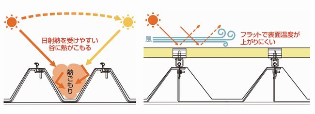 工場・倉庫の屋根に多く使われている山谷形状の「折板屋根」は、断面強度などに優れる一方、平面状の屋根よりも日光による受熱面積が大きく、風の当たりにくい谷状の部分に熱がこもりやすい特性がある。元旦エコパネルは平滑葺き金属屋根「マッタラールーフ(※)」を使って屋根表面をフラット化することで、受熱面を減らすとともに通風時の冷却性を高める効果を見込む(図1)。
