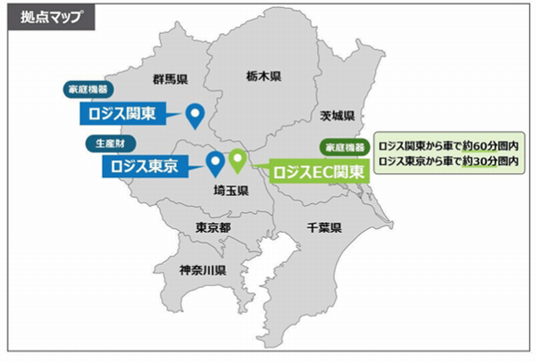 「LOGI’Q白岡Ⅱ」の2・3Fの約5000坪(トラックバース含む)を賃借し、家庭機器事業部の商品約5000アイテムを保管する。