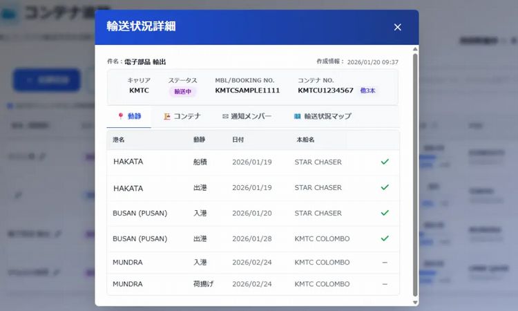 輸送状況詳細(入出港や積替えなどの動静を時系列で表示)