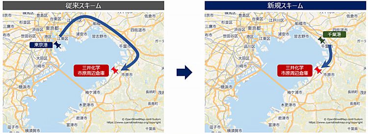 三井化学はシンガポールからの一部輸入製品について、DXを活用して最適な揚港の使用比率を計算し、千葉県および船社、物流業者との協議を重ねた結果、揚港を東京港から千葉港へ集約する取り組みを2025年9月にスタート。該当製品の輸送に関わる温室効果ガス排出量とドライバー工数を約70%削減することに成功したという。対象は港~市原周辺倉庫の陸送部分。