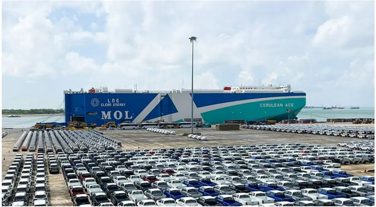 商船三井のLNG(液化天然ガス)燃料自動車船「CERULEAN ACE」のシンガポール荷役風景(商船三井提供)