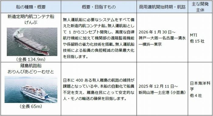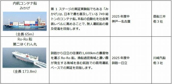 自動運転レベル4(特定条件下での無人)相当で、一般貨物を搭載。神戸と静岡、東京などの間を結ぶ。船員不足対応や航行の負荷軽減と安全性強化を目指す。日本財団は、貨物航路で商用自動運航に踏み切ったのは世界で初めてと強調している。