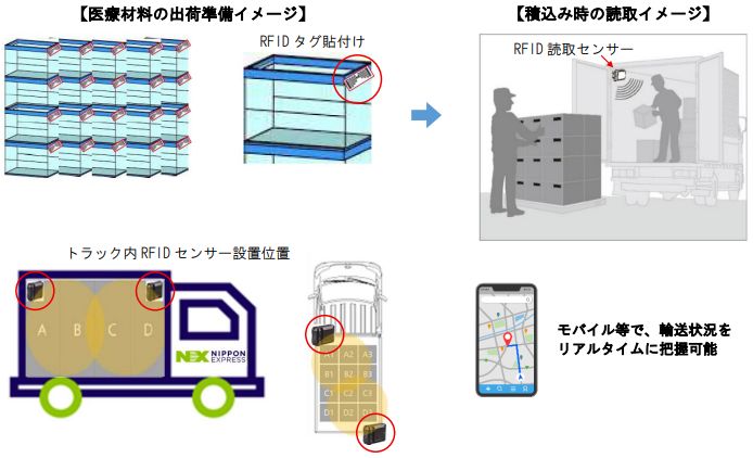 医療材料のトレーサビリティーを確立するため、日本通運と共同で、医療材料に貼り付けたRFIDを活用し、「SHIPグランベース東京」から各医療機関に届けるトラックにもRFIDセンサーを取り付けて、医療材料の出荷から納品までの位置情報をリアルタイムで追跡・管理するトラッキングシステムを開発する。
