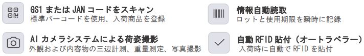 災害時に備えた十分な在庫を保有し、耐震性に優れたBCP対応の施設に、東京大学発で米国拠点のベンチャーRENATUS ROBOTICS(レナトスロボティクス)製自動倉庫システム「RENATUS」(レナトス)を導入。AIやロボティクス、RFIDなどの先進技術を活用した次世代型物流拠点として運営する。