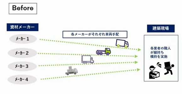 具体的には、都市近郊に配置した門前倉庫に各メーカーの資材を集約し、WMS(倉庫管理システム)で在庫と入出庫を一括管理。建設工程に合わせて必要な資材を複数メーカー分まとめてジャストインタイムで共同配送する。