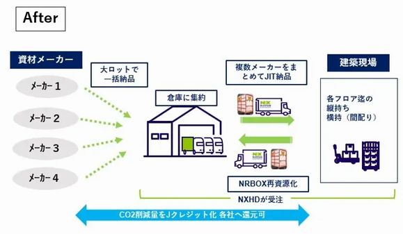 多くの課題を解決するため、日通は倉庫・輸送・オフィス移転で培ったノウハウを活かし、物流から建設現場の最適化を支援する新たなスキームを構築した。