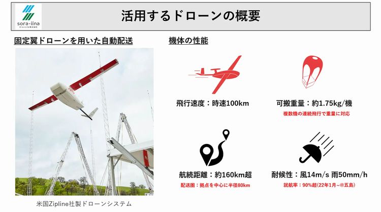 長距離飛行可能な米国Zipline(ジップライン)製固定翼ドローンを利用し、事前に飛行許可を取得した指定経路に沿って飛行させる。陸路では60分掛かる距離を半分以下の25分で届けられるという。