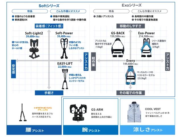 現場作業着により馴染みやすく、汚れが目立ちにくい配色へ変更。製造・物流・農業・建設業など、空調管理が難しい現場に適している。旧来のモデルと同様、高所作業用のフルハーネスや、マッスルスーツSoftシリーズとの併用も可能。