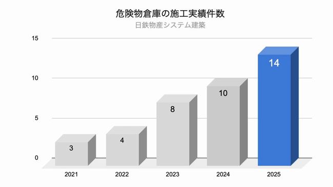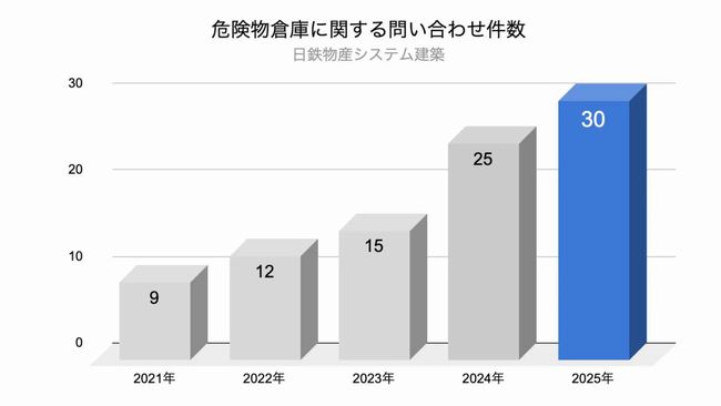 過去5年間で20件・39棟の危険物倉庫を施工させた。危険物倉庫に関する問い合わせ件数は2021年の9件から25年には30件と約3.3倍に増加。施工実績も同期間で3件から14件へ約4.6倍に伸びた。