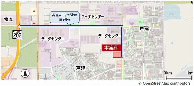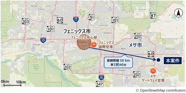 メサはアリゾナ州の中部に位置する人口約51万人の都市で、近年人口増加や企業進出が著しいフェニックス都市圏(人口約519万人)に位置。開発エリアは高速道路や空港へアクセスしやすく、大手企業のデータセンターや物流施設が多数立地するなど、今後も物流施設需要が見込まれるため、開発に乗り出した。