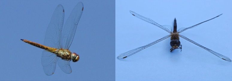 飛翔するウスバキトンボの成虫(左)と日本郵船運航船上で観察した成虫(プレスリリースより引用)