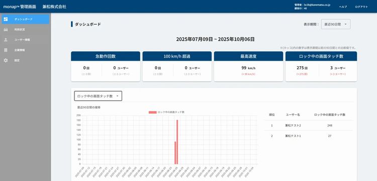 管理画面で各車の利用状況(ロック中の画面タップ回数、急制動・発信の回数など)をモニタリングできる点や、企業ごとの安全ポリシーに合わせた柔軟な運用が可能である点が特徴。ドライバーの運転行動の傾向を把握し、スコアリングやフィードバックを通じて個々の安全意識の向上を促すこともできるようにしている。
