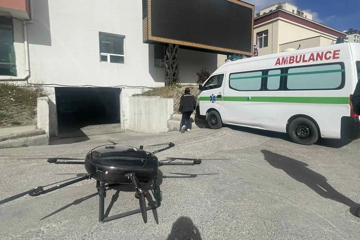 市内の病院へ向けて血液製剤を載せて飛行する前の物流ドローン(モンゴル国立輸血センター)