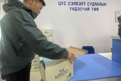 モンゴル国立輸血センターから受け取った血液製剤と物流ドローン専用箱(同センター)