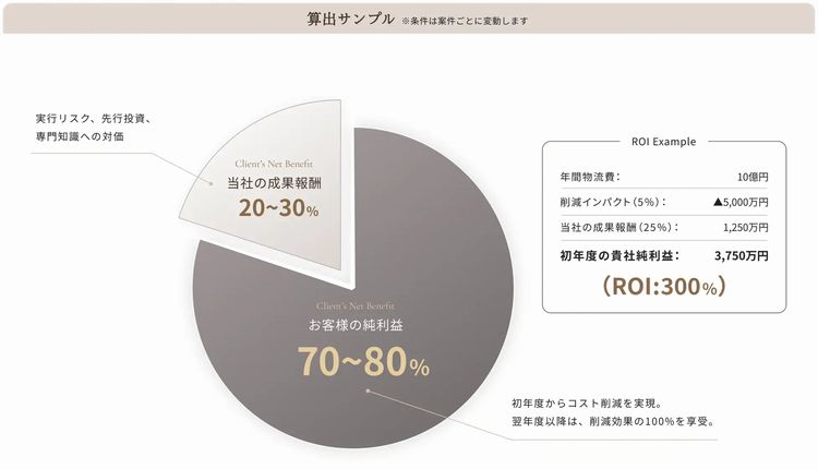 サプライチェーン変革企画の立案から実行・定着までフルコミットし、削減できた輸送コストや向上した売り上げに対する成果報酬を得る。