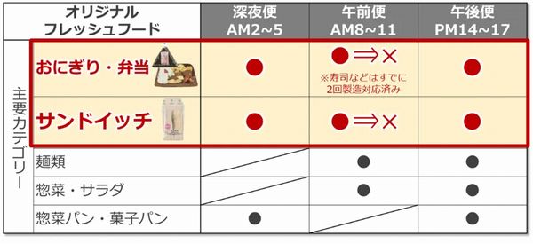 セブン‐イレブンのオリジナルフレッシュフードのうち、販売構成比の高い商品群のおにぎり・弁当・サンドイッチの約60アイテムに関し、北海道エリアで製造回数をこれまでの1日3回から2回(深夜便・午後便)に削減する。店舗への総配送回数に変更はない。