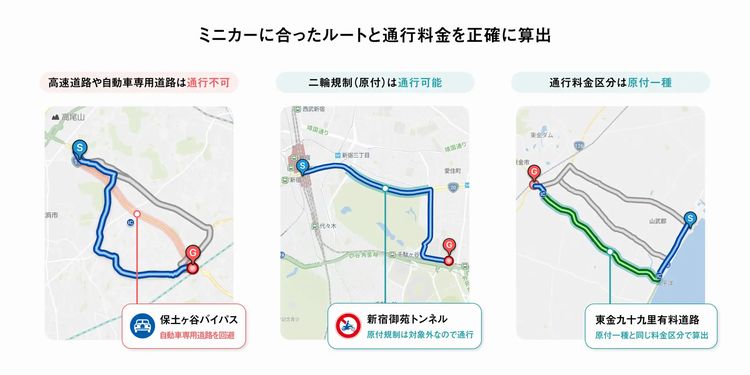 50cc以下の三輪・四輪車のミニカー向け交通規制に合わせ、高速道路や自動車専用道路を回避しながら、通行可能な有料道路を考慮した、安全で効率的なルートを案内する。原付一種と混同されがちな30km/h制限や二段階右折は対象外となるため、ミニカー走行条件に即したナビゲーションを可能にする。