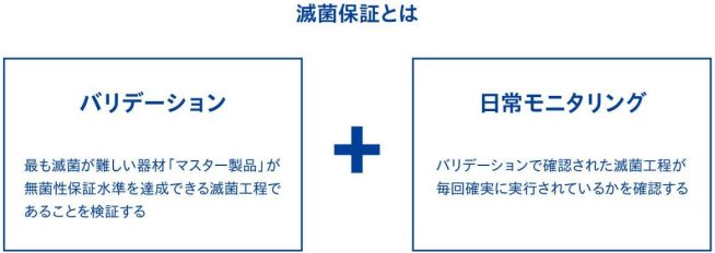 滅菌保証は「バリデーション」(稼働性能適格性確認)と呼ばれる、対象の医療施設の無菌性を確認する試験をパスすることと、バリデーションで確認した工程が毎回の減菌で正しく実施しているかをチェックする「日常モニタリング」で構成。