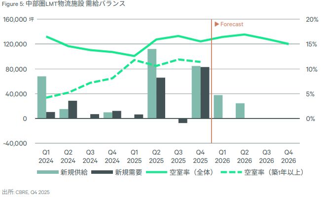 一方、26年の新規供給は16.7万坪で、25年実績(40.1万坪)の4割程度にとどまる見込み。26年第1四半期(1~3月)に竣工する予定の3棟は全て満床稼働となるもようのため、CBREEは「空室率は今後3%台へ低下する」と予測している。