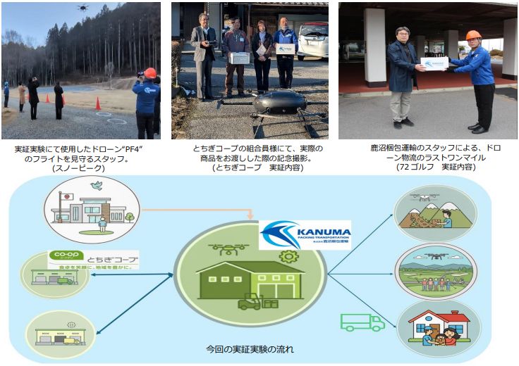 セイノーホールディングス(HD)と鹿沼梱包運輸(栃木県鹿沼市)、栃木県鹿沼市、とちぎコープ生活協同組合(栃木県宇都宮市)の4者は2月13日、鹿沼市内で2月4~10日、ドローン配送の実証実験を、西濃運輸の代理店として初のドローンポート併設型の自社倉庫と自社内でリモートパイロットを準備、実施したと発表した。