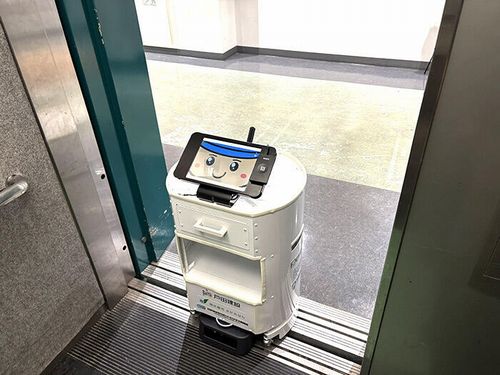 ロボットとエレベーターが通信で連携し、ロボット自らエレベーターを呼び出して目的階へ移動する「完全自動のフロア間移動」を行う。