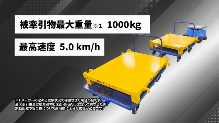 従来の最大600kgが牽引できる標準タイプに加え、より重量のあるパレットやかご台車の搬送に対応できるようにしている。移動速度も向上させ、広大な工場や倉庫内の搬送時間を短縮し、慢性的な人手不足の解消と生産性向上をより強力に後押しする。