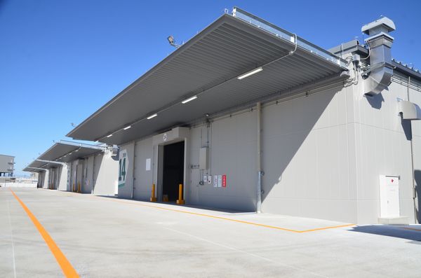 ドライ倉庫との一体運用を視野に入れ、安全設備面でも全棟で高性能の泡消火設備を採用。泡消火設備は一部の金属や水分と激しく反応する保管品以外の危険物に幅広く対応するという。また、保管品の液漏れに備え、床面中央から壁面に向かって緩やかな勾配を設けている。各棟はウイング車が接触できる奥行き5mのひさしも備えており、雨天時の荷降ろし作業もスムーズに進められるよう配慮している。