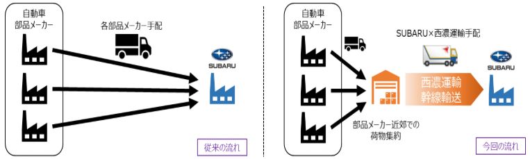 協業の開始で中京地区の自動車部品メーカーは西濃運輸豊川支店へ部品を持ち込むだけで済み、SUBARUは以降の幹線輸送を主体となって手配・管理することが可能になると想定。