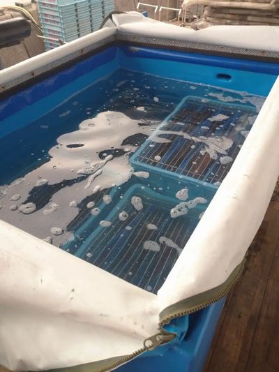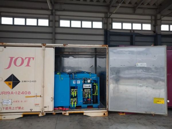 魚活ボックスは活魚輸送を目的とした専用コンテナで、水容量は約1200l。エアレーションポンプで酸素を供給し、溶存酸素濃度を常時計測、規定値以下になった場合は自動で酸素を供給する。