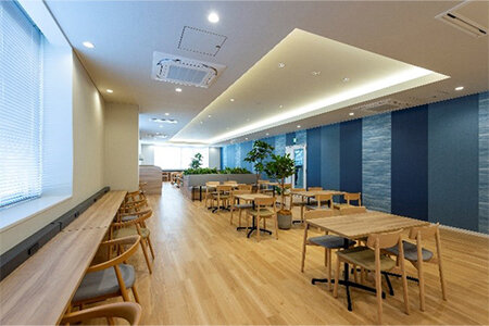 各階のカフェラウンジは三郷市伝統の”藍染”をコンセプトにしている。