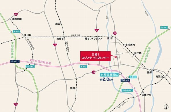 交通手段:外環道「外環三郷西IC」から約2km、JR武蔵野線「新三郷」駅から約2.3km